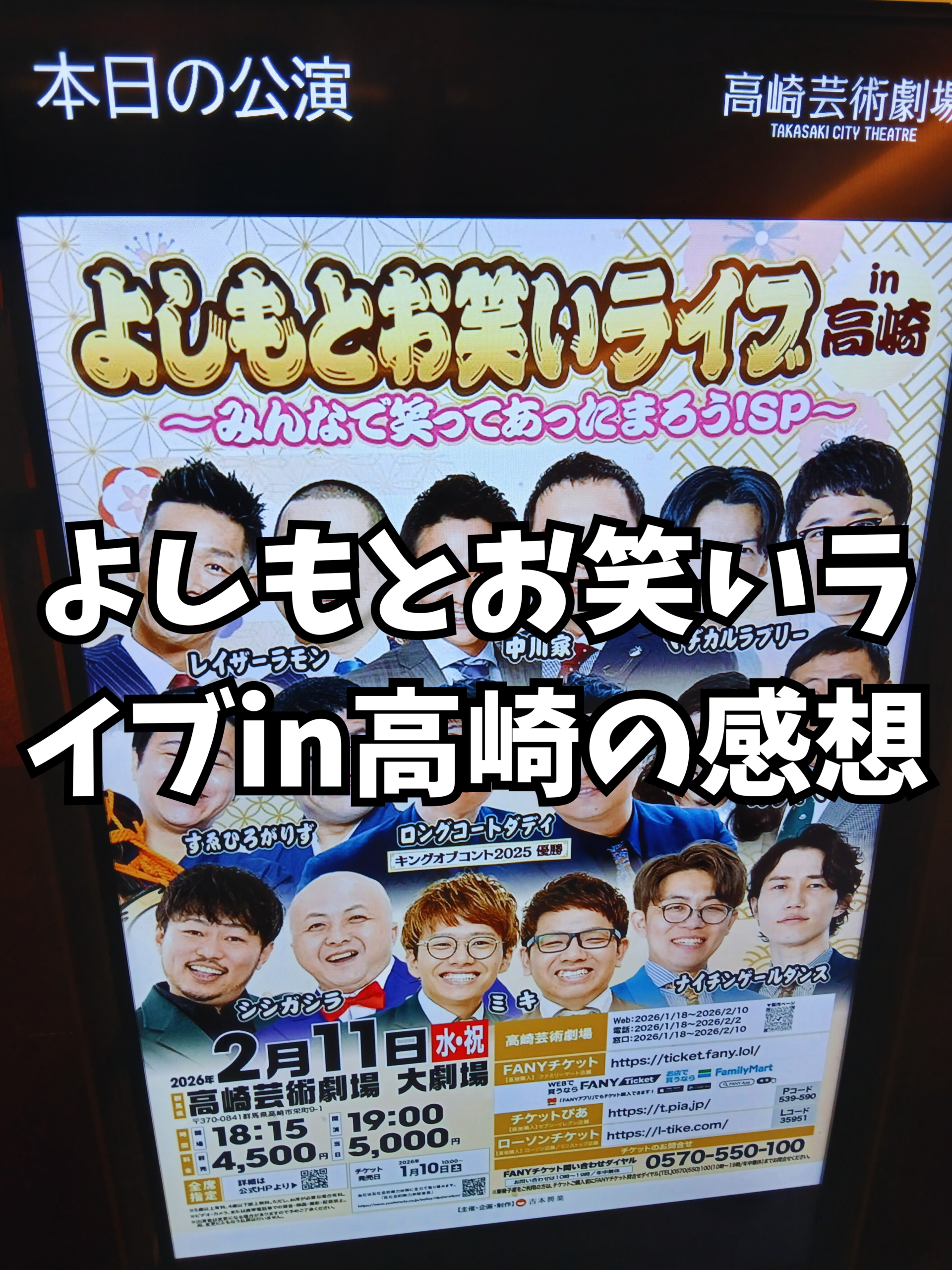 2月11日(水)よしもとお笑いライブin高崎が高崎芸術劇場で行われましたので感想を書いていきたいと思います。よろしくお願いいたします。